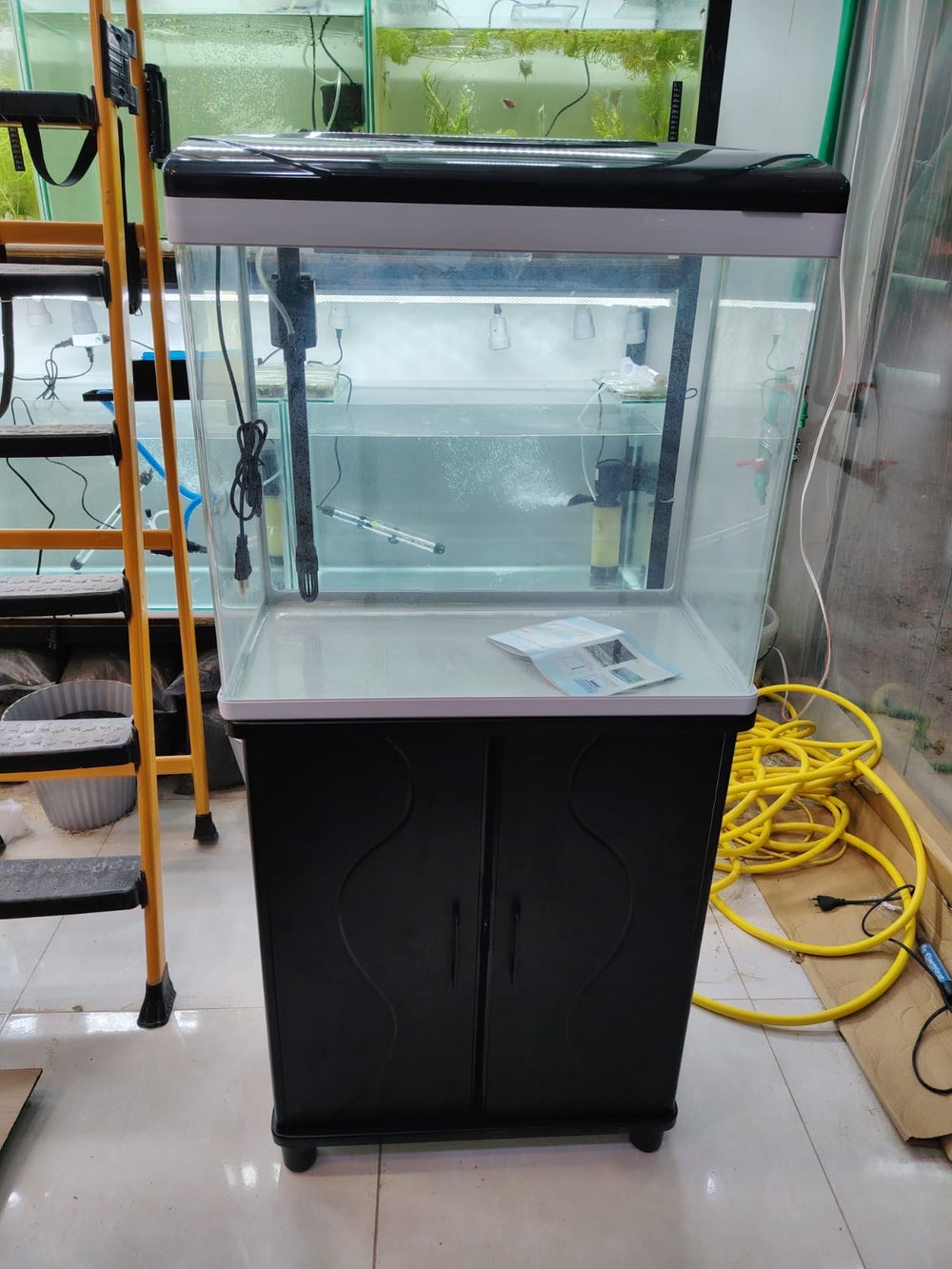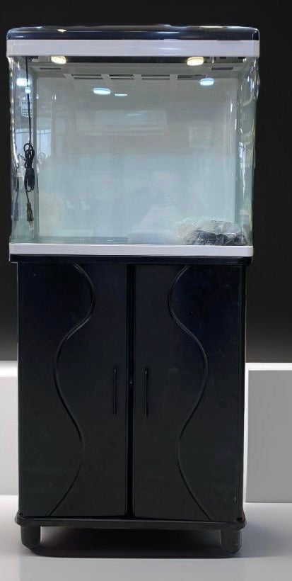 حوض أسماك أنيق بقياس 56، يأتي مع ميز (ستاند) ثابت وقوي، وفلتر سقفي بجميع ملحقاته لضمان تنقية ممتازة للمياه.